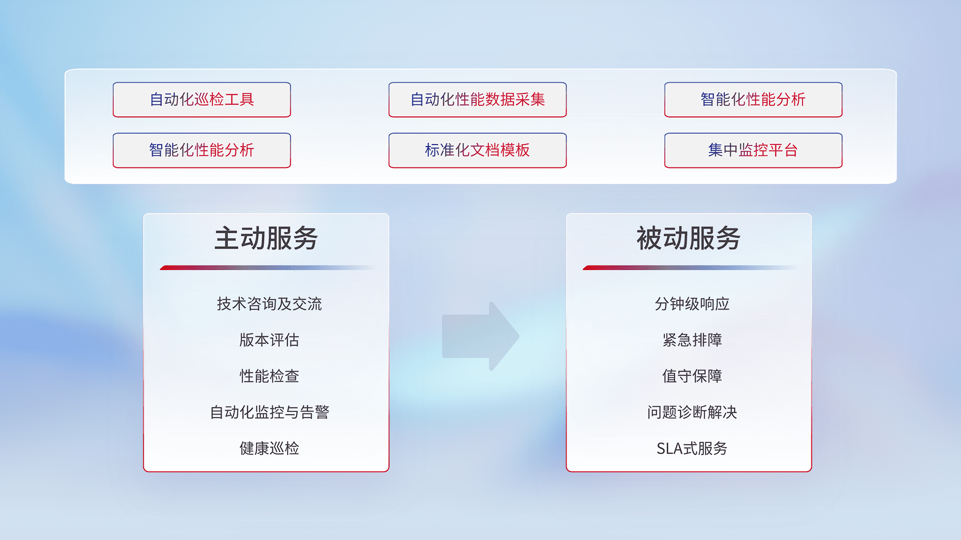 智能化工具和标准化文档,,保障服务质量,,,提供主动服务(包含技术咨询、、、版本评估、、、性能检查、、、、自动化监控与告警、、、健康巡检)和被动服务包含(分钟级响应、、、、紧急排障、、值守保障、、、问题诊断解决、、、SLA服务)。。